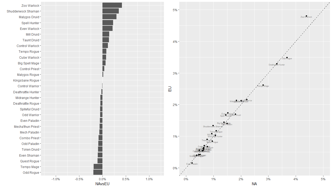 To summarize, we can establish that the metas don't end up in the same place even though there are common threads between them. Zoo Warlock, Odd Rogue and Deathrattle Hunter may still be the most popular archetypes in all 4 regions, but their play-rates differ enough between servers that it's noticeable when queuing up on ladder.