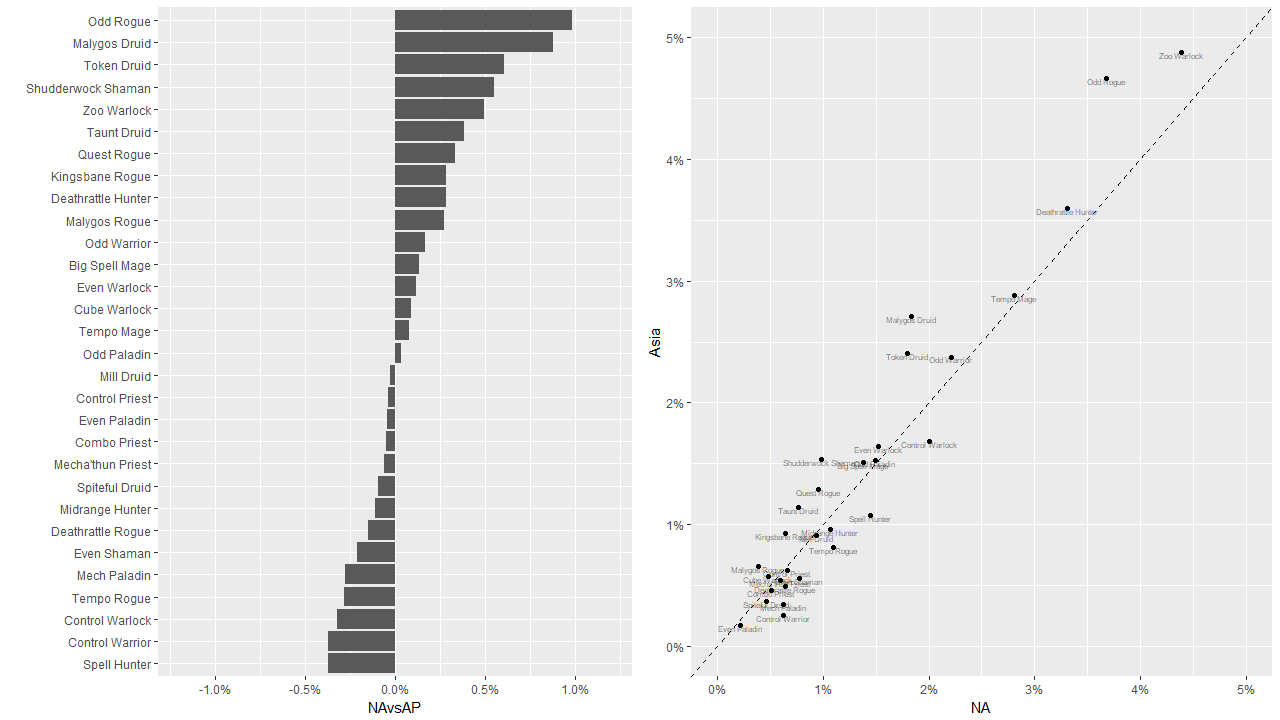 While Zoo Warlock is the dominant deck (by play-rate) on NA and EU, Odd Rogue is much closer in the Asia region. And even though a 1% increase in play-rate might not seem like much, this actually means Odd Rogue is ~27% more popular in Asia than in NA.