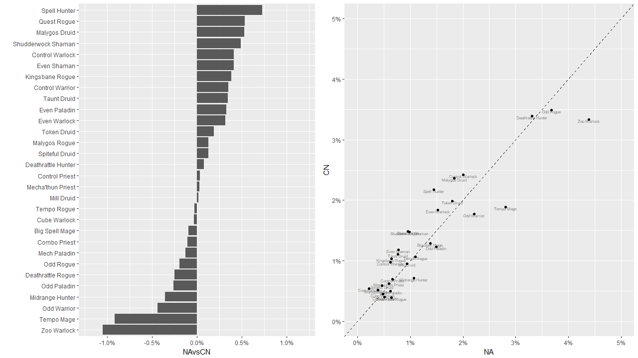 Moving on to the China server, we see even greater variation. Both Odd Rogue and Deathrattle Hunter trump Zoo Warlock in terms of play-rates. Staples of the NA meta such as Tempo Mage and Odd Warrior see significantly less play. If you're not a fan of Quest Rogue, you're probably not going to want to switch servers any time soon.