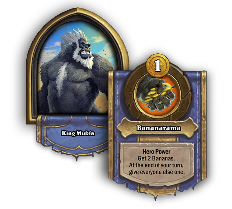 King Mukla used to give you a Banana every time you purchased a Beast. Now, his hero power for 1 mana will give you 2 Bananas. Be careful though! Mukla is a bit reckless, so all other players will get 1 Banana at the end of your turn as well.