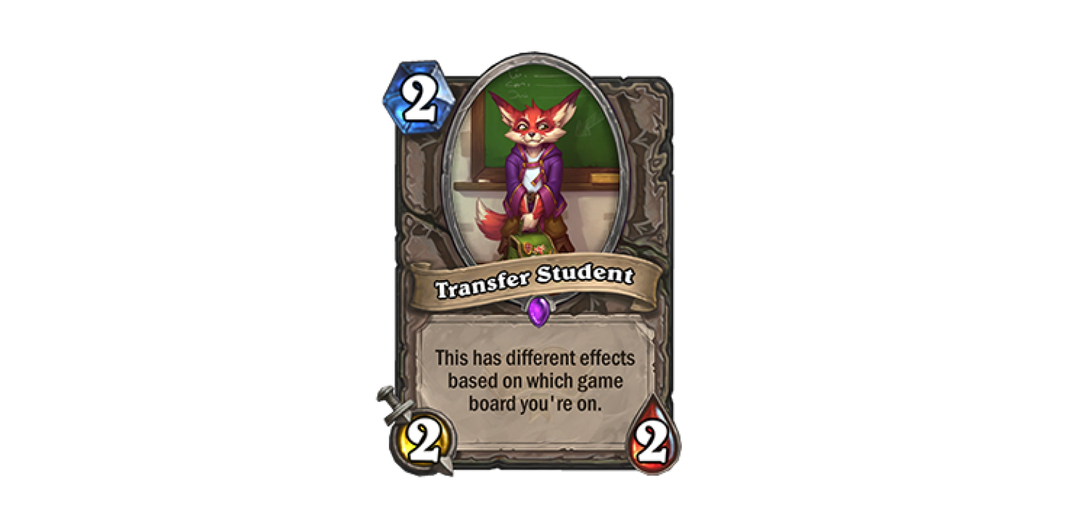 With today’s 17.6 patch all players can log in to receive two copies of the Epic Neutral minion, Transfer Student, for free!* Transfer Student has different effects based on which game board it’s played on, with 25 different effects in total, and can be slotted into your decks immediately!