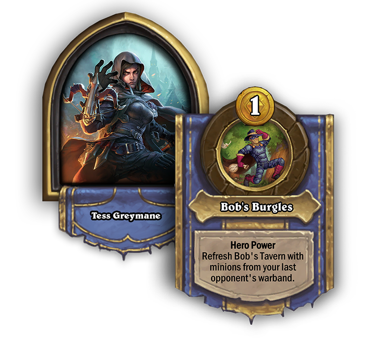 Brand new to Battlegrounds is Tess Greymane. A fan-favorite Rogue card from The Witchwood, Tess's hero power in this game mode will refresh Bob's Tavern with minions from your opponent's last warband (without enchantments).