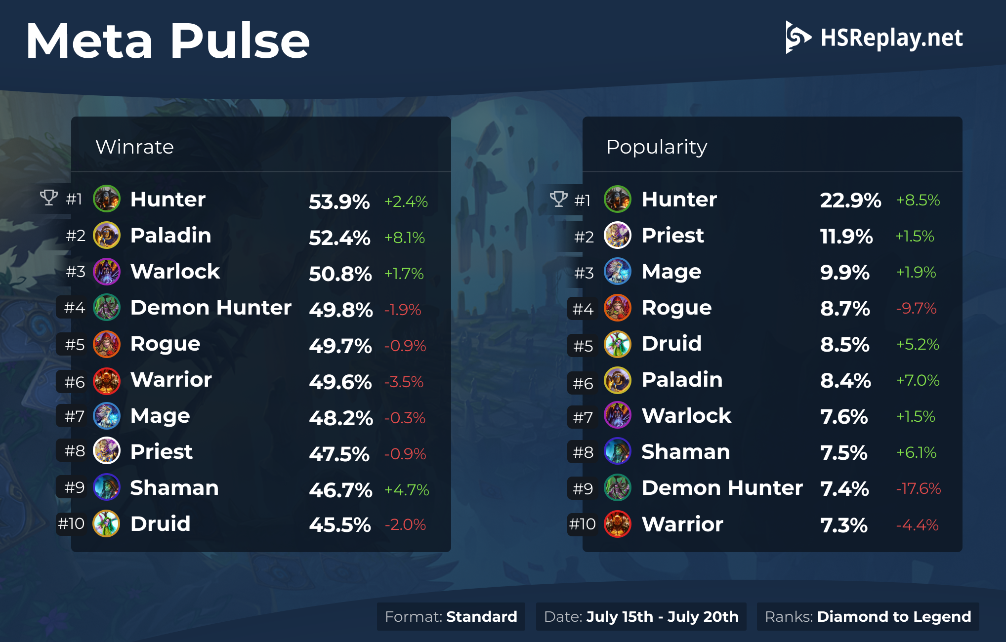The class finally took a hard hit in this round of nerfs. But don't count it out quite yet. The massive 17.6% drop in popularity metric mostly means that the majority of ladder and legend grinders want to move to something more reliable. Demon Hunter has a good chance to rebuild itself. Even if that doesn't happen this expansion, Scholomance Academy is likely to bring a lot of relevancy to the class. Now it has room to breathe and receive those new tools.