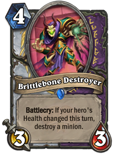 Brittlebone Destroyer should be the new go-to for hard removal in both Priest and Warlock. The simplest combinations to be used with it are Warlock's hero power and Renew. Flik Skyshiv has been a must-include in every Rogue deck because even if it just removes one minion, it's targeted and not dependent on anything else. Though this does have a requirement, it doesn't seem to be asking much for a seriously powerful effect.