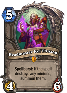 The iconic Headmaster Kel'Thuzad is bringing his power to all classes. Think of this effect similar to Firelands Portal or Apexis Blast but with a guaranteed result for complete removal. Any AOE or hard removal should be carefully considered with him. Cards like Shadow Word: Ruin or Plague of Wrath could be devastating in the right situations. One of the most powerful combinations currently might be with Shadowflame. With another minion on the board to target, you could ideally clear your opponent's board and get their minions and your own back. It will be interesting to see if there are enough board states that let you take advantage of Kel'Thuzad reliably. Otherwise as a 4/6, it's not doing much for you.