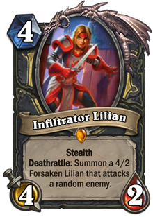 The new Rogue legendary Infiltrator Lillian has a lot of stats for 4 mana. It may seem underwhelming at first glance. But when you consider that its front half will likely be able to attack into something (akin to 1 charge of a Truesilver Champion) and then guarantees a second hit somewhere else, the 8 damage for 4 is pretty good. Not to mention, there are plenty of other cards to take advantage of the effect like Anka, the Buried and Necrium Apothecary.