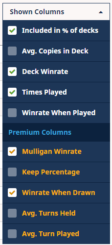 Starting today, Premium members can access mulligan statistics directly from the Cards page, including Mulligan Winrate, Winrate When Drawn, and more.