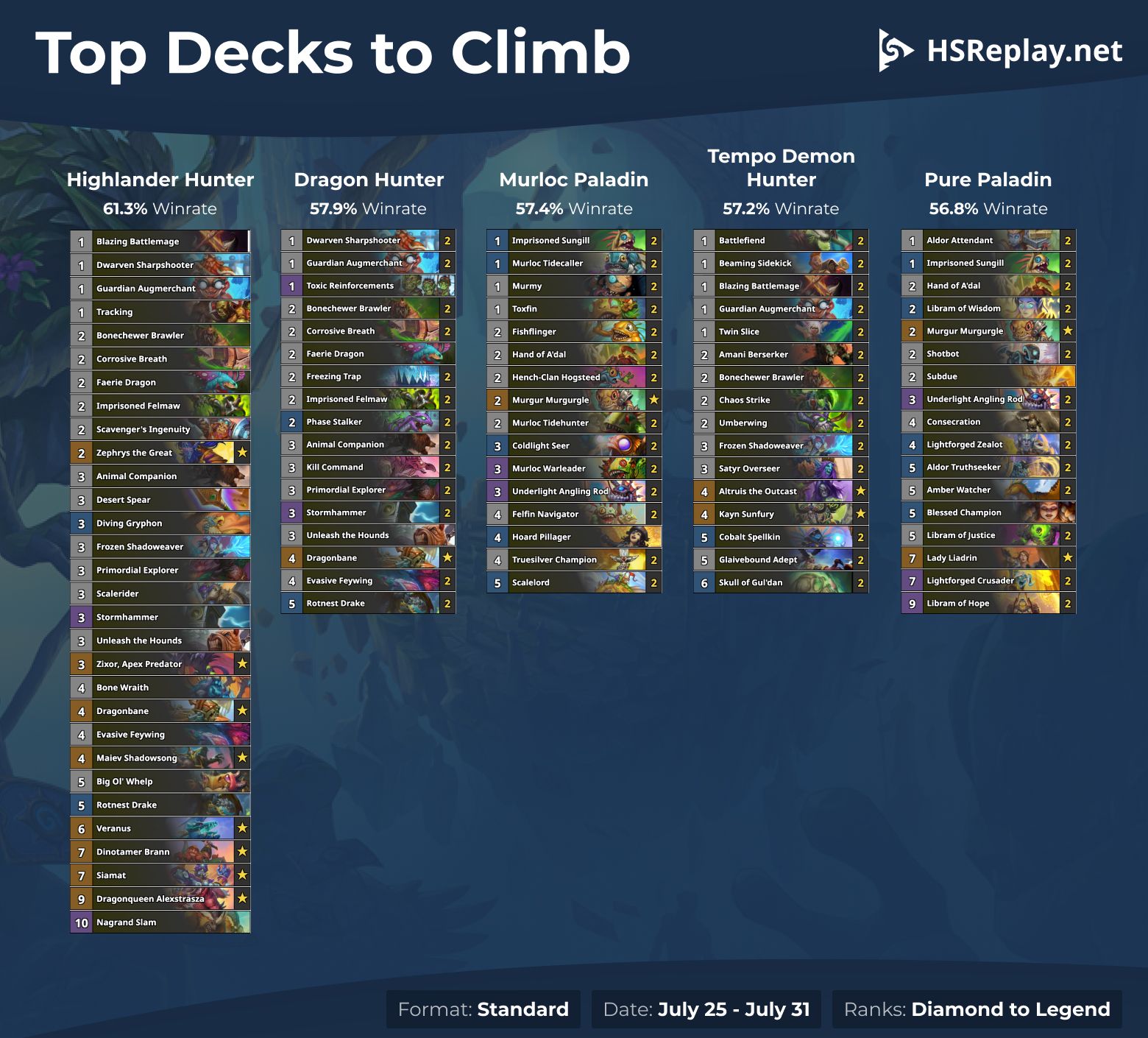 Murloc Paladin and Tempo Demon Hunter are reliable ways to outrun both of these Hunter decks, they're taking a prominent position as well. We recommend trying this Demon Hunter list for its advantage over all of the top 3 archetypes. Yes, after 5 rounds of balance changes, Demon Hunter is still very strong.