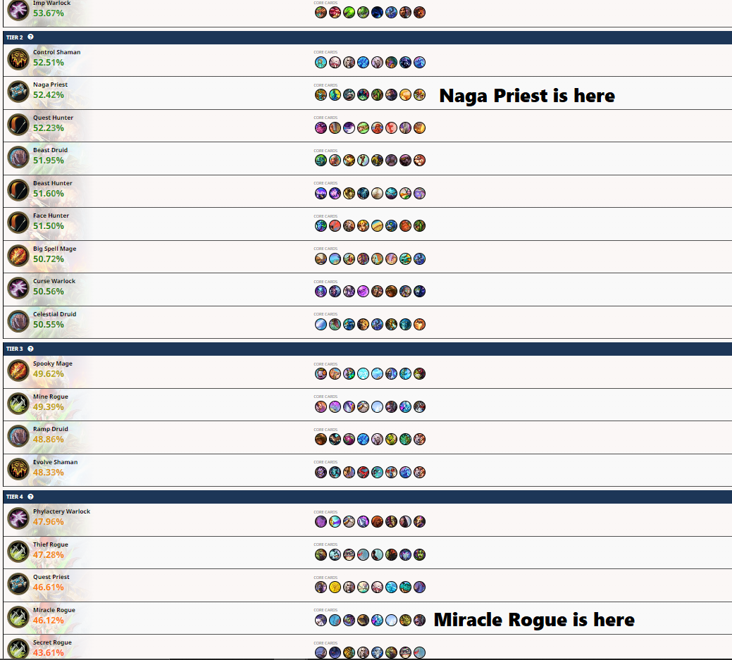 - Naga Priest was kind of expected, as the deck is routinely listed as a top 5 performer on ladder according to stats. Although the deck was mostly expected in a line-up that targets Druid, it isn't so surprising to see people bring the archetype. At least compared to Miracle Rogue and its abysmal 46% win rate and tier 4 placement at the time of the tournament.