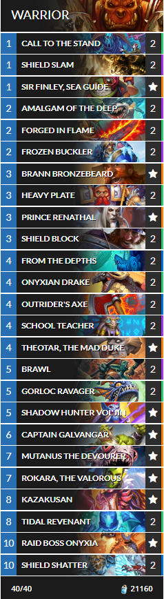 Also, the card is looking great alongside Warrior's AoE cards like Brawl or Shield Shatter, as the summoned unit will likely be removed on the spot. For all those reasons, I believe control players probably want to give the deck a shot before giving up on the class until the next expansion. Warrior players as a whole probably only have this option, considering nothing was added to the Enrage archetype.
