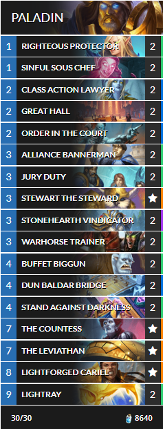 Lastly, there is Order in the Court, a bit of an enigma for me. On the one hand, the card is obviously strong and could be played as a simple “Draw Cariel and Countess more often” kind of tool. It could be enough to make Paladin better than it is now, and with the Class Action Lawyer as a great early game tool, the deck also found some good sustain.