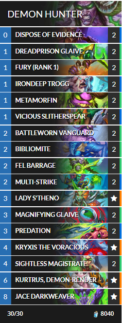 Moving on to Demon Hunter now, who received one of the two class legendaries of this mini-set: Prosecutor Mel'tranix. I've read a lot of different things about the card, from players happy to see more disruption to others lamenting its existence already.