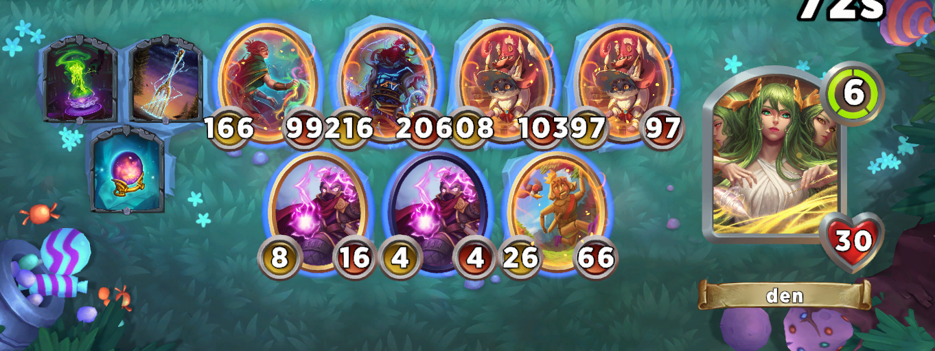 The basic of the Spell synergy are two units: Wizard's Familiar and Spell Weaver, both units that grow as we play spells. Later on, they will be complemented with Monster Book for more spells, and Aon, for even more growth. Scion of the Storm waits in Tier 6 and should huge by the time you can purchase it.