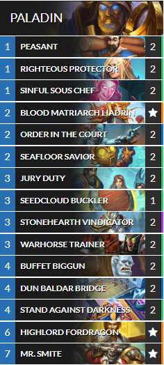 Instead, my goal is to use all those Divine Shield in order to buff Mr.Smite thanks to Highlord Fordragon passive effect. Alongside Order in the Court, the duo should be very reliable to find and play on curve.